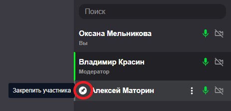 Для закрепления участника в большом окне, наведите на участника и нажмите соответствующую кнопку, как показано на рисунке ниже: