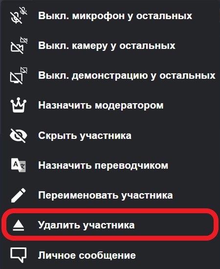 Для отключения камеры и микрофона у одного участника, нажмите на соответствующую кнопку справа от имени участника: