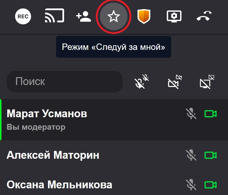 Модератор может включить режим «Следуй за мной». В этом режиме все участники конференции будут видеть тот же режим отображения участников, что и модератор.