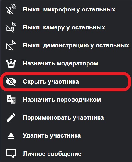 Во время конференции модератор может скрыть свое изображение или выбранного участника от всех остальных участников. После скрытия, участник не будет виден в раскладках. В списке участников он будет помечен как «Скрытый» для остальных участников.