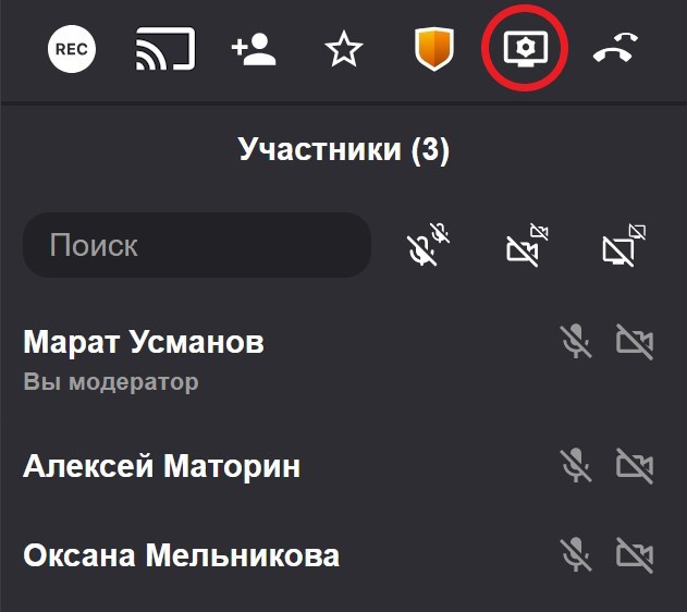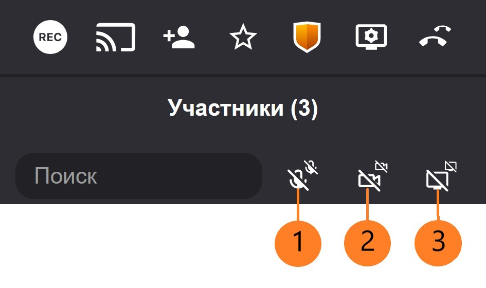 Для отключения камеры и микрофона у всех участников нажмите на один из элементов управления в верхней части списка участников: