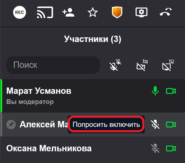 Для отправки участнику запроса на включение микрофона, нажмите на выключенную иконку микрофона справа от имени участника: