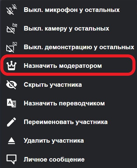 У модератора есть возможность отключения камеры, микрофона и демонстрации экрана у всех участников за исключением выбранного.