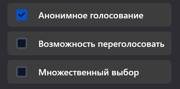 - Анонимное голосование. Участники будут видеть количество отданных голосов за тот или иной вариант ответа, но не будут знать, кто за что проголосовал.