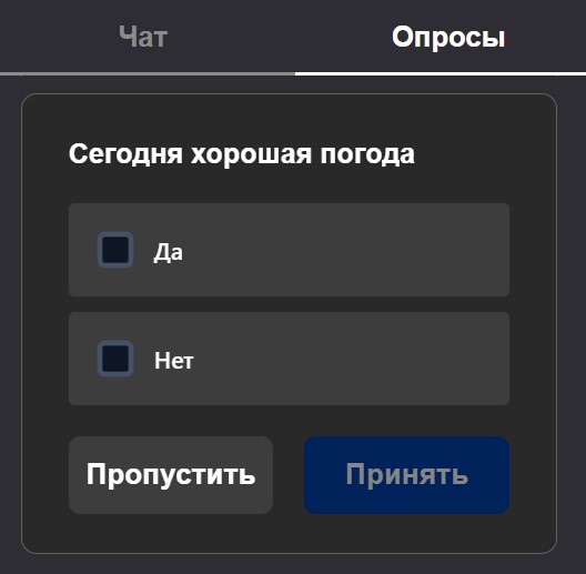 Для участия в опросе, откройте «Чат» в панели управления и перейдите во вкладку опросы, где уже будет видно активный опрос. Выберите вариант ответа и нажмите принять:
