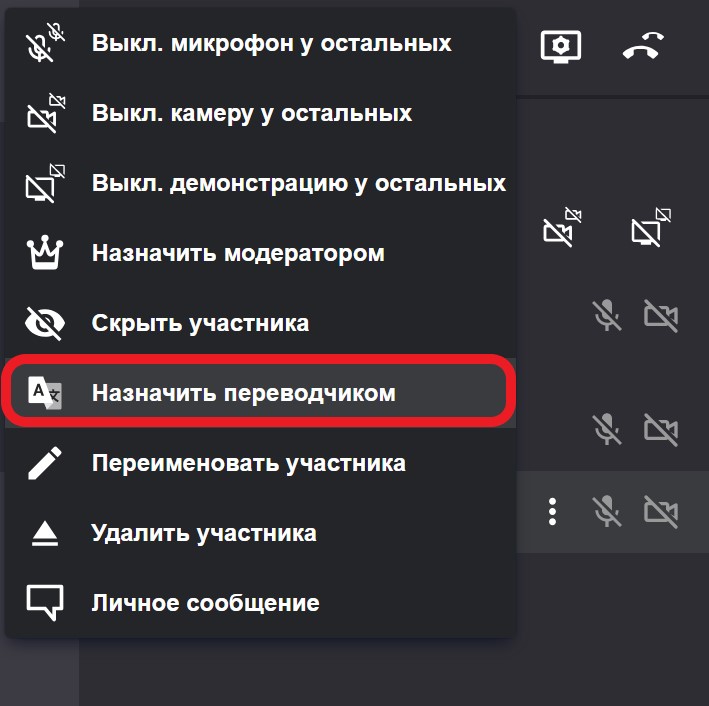 рядом с нужным участником и выберите пункт «Назначить переводчиком», как показано на рисунке ниже: