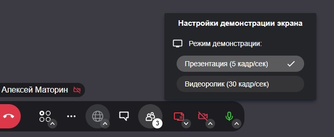 Для этого откройте меню «Настройки демонстрации экрана», как показано на рисунке ниже и выберите необходимый режим: