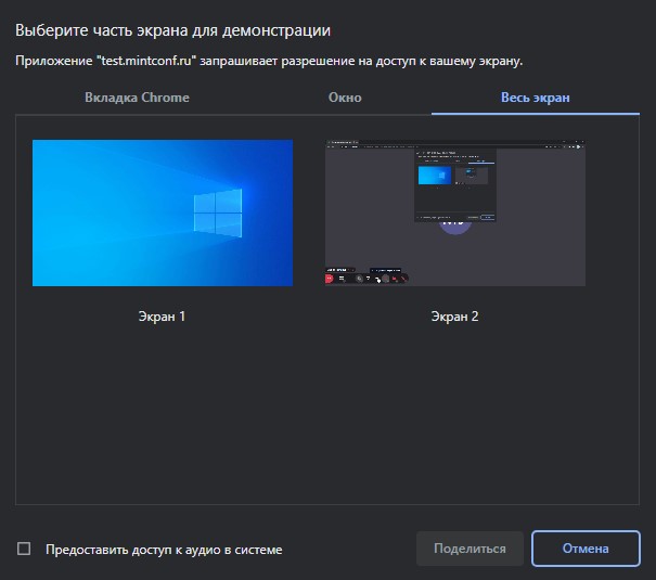 Выберите один из режимов демонстрации и нажмите кнопку «Поделиться»: - «Весь экран» - демонстрируете все действия на экране вашего компьютера/ноутбука. Если ваша презентация должна идти со звуком, то не забудьте нажать галочку «Предоставить доступ к аудио в системе». - «Окно программы» - демонстрация содержимого одной из открытых у вас программ (Word, Acrobat, PowerPoint и т.п.). - «Вкладка Chrome» - демонстрация одной из открытых вкладок в браузере, который используется для конференции.